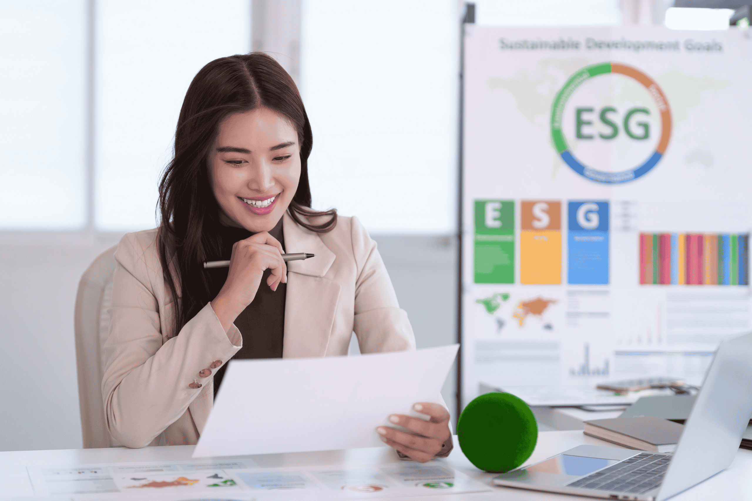 (Para cego ver: mulher jovem, de cabelos longos e escuros, sentada em uma mesa de escritório clara, sorri enquanto segura uma folha de papel e uma caneta. Ela veste blazer bege sobre roupa escura. Ao fundo, há um painel com a sigla “ESG” em destaque, gráficos coloridos e um mapa-múndi, sugerindo um ambiente corporativo ligado a sustentabilidade. Sobre a mesa, aparecem documentos com gráficos, um notebook, um laptop e um pequeno objeto verde em formato arredondado.)