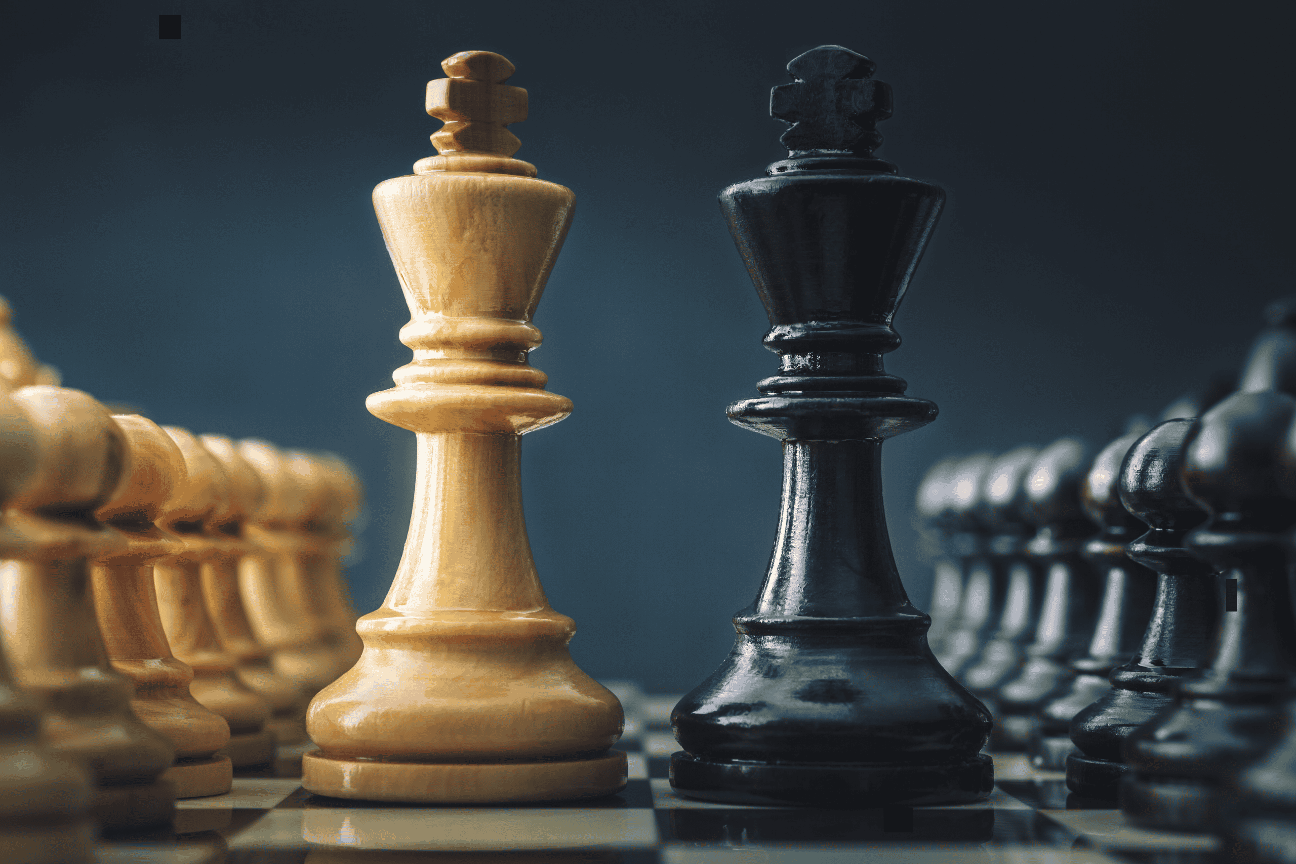 (Para cego ver: duas peças de xadrez, uma clara e uma preta, estão lado a lado no centro do tabuleiro, em destaque. Ao fundo, outras peças aparecem desfocadas dos dois lados. A imagem sugere confronto, estratégia e equilíbrio de forças.)